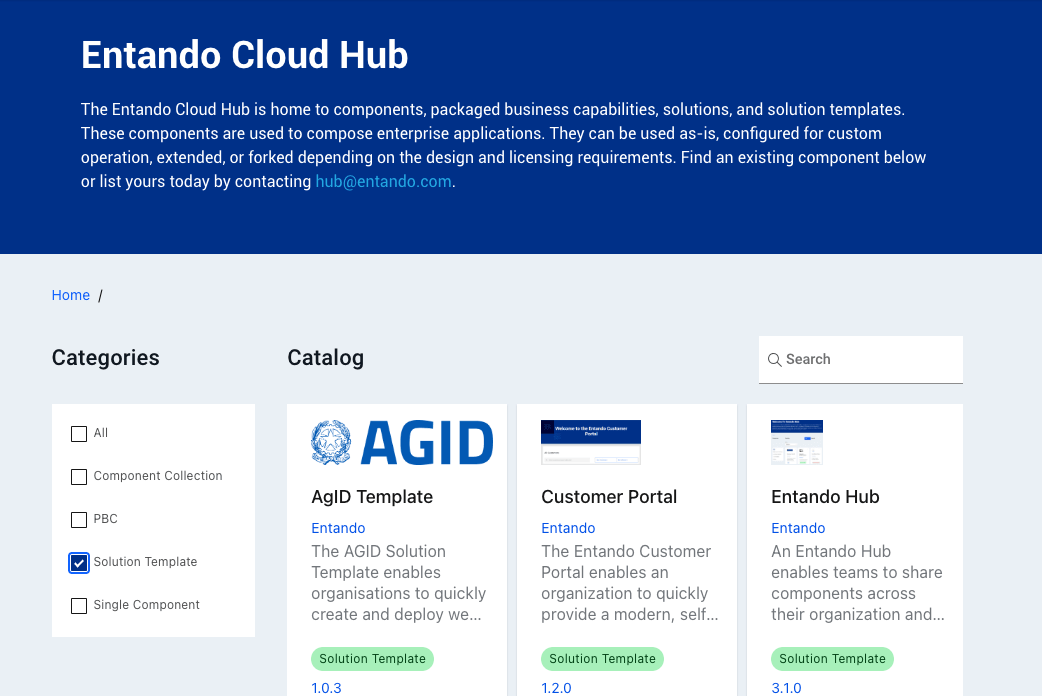 These Solution Templates, and other packaged business capabilities (PBCs), are available in the Entando Marketplace Hub (opens new window).